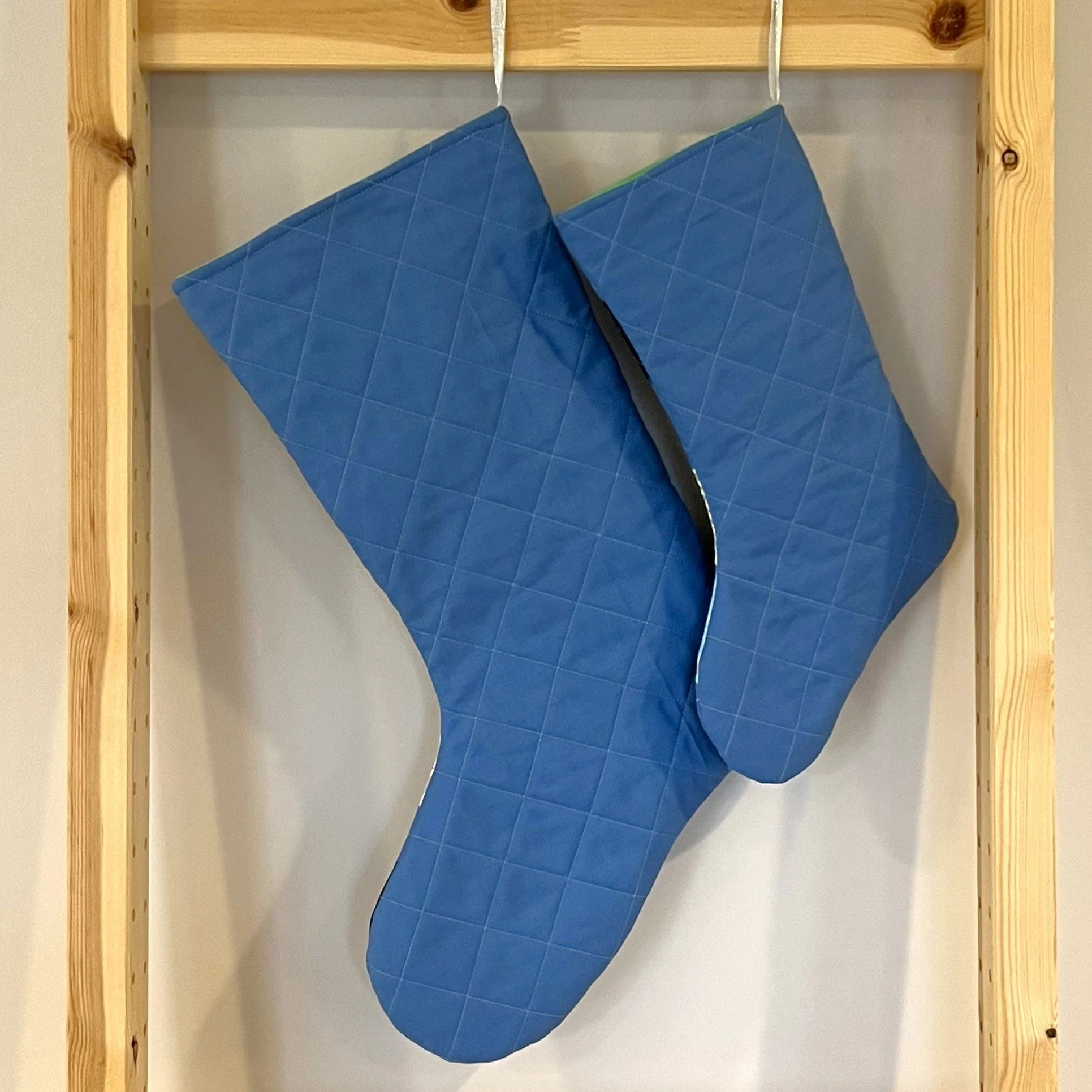 Finished blue stockings. I quilted these, and all of the other stockings, on my domestic machine with a crosshatch pattern.