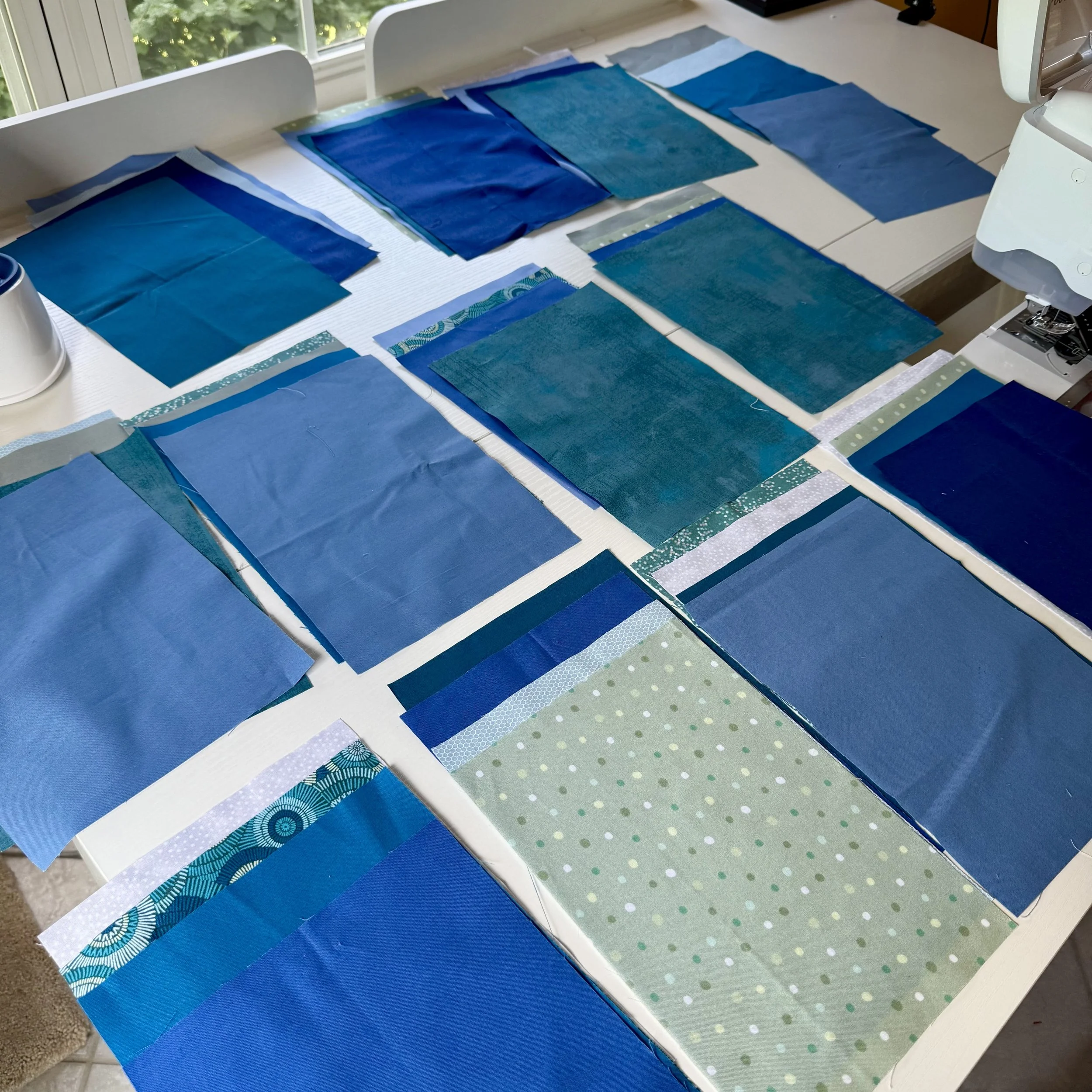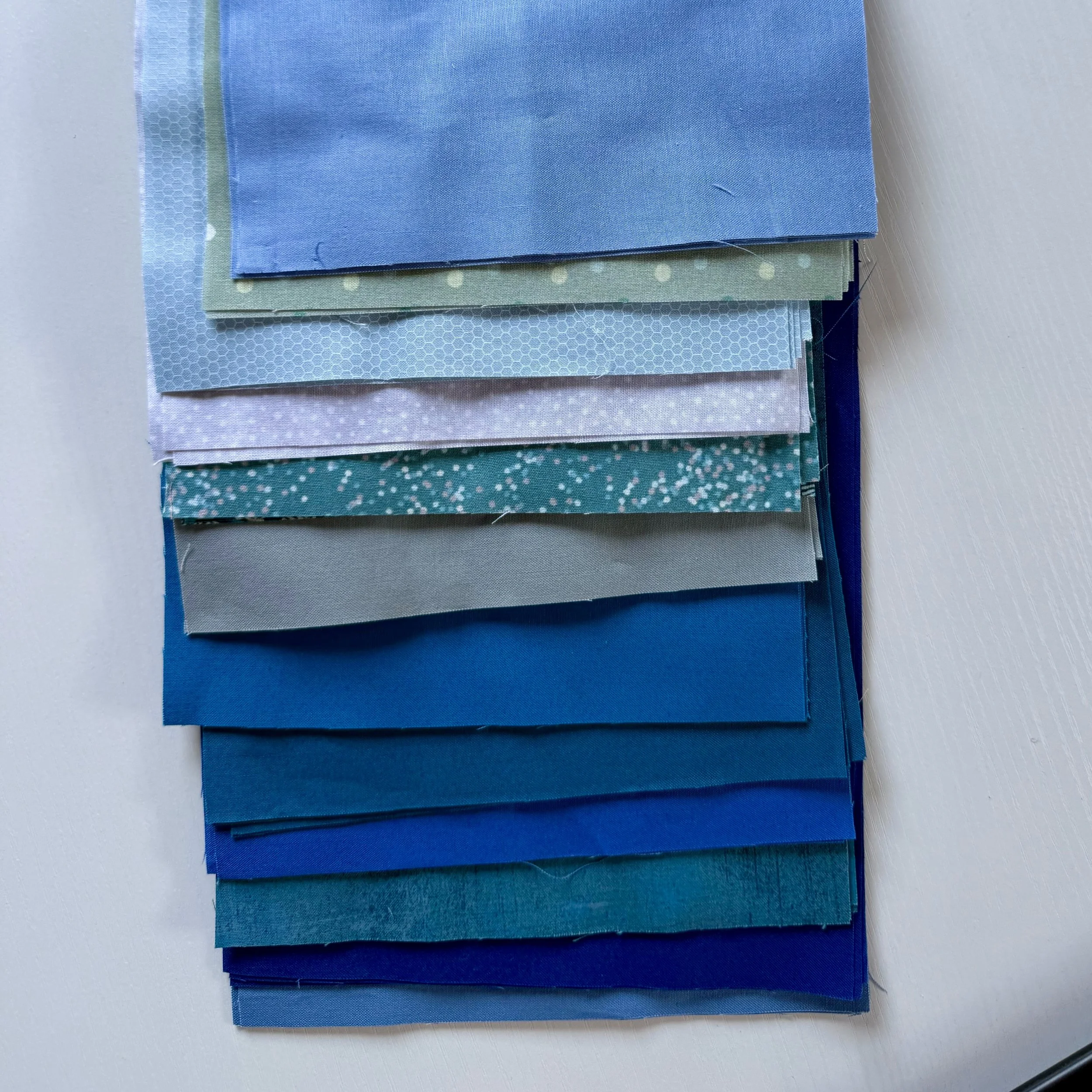 For Drunken Tiles, I pulled 12 different fabrics from my stash that were mostly blue or turquoise in color.