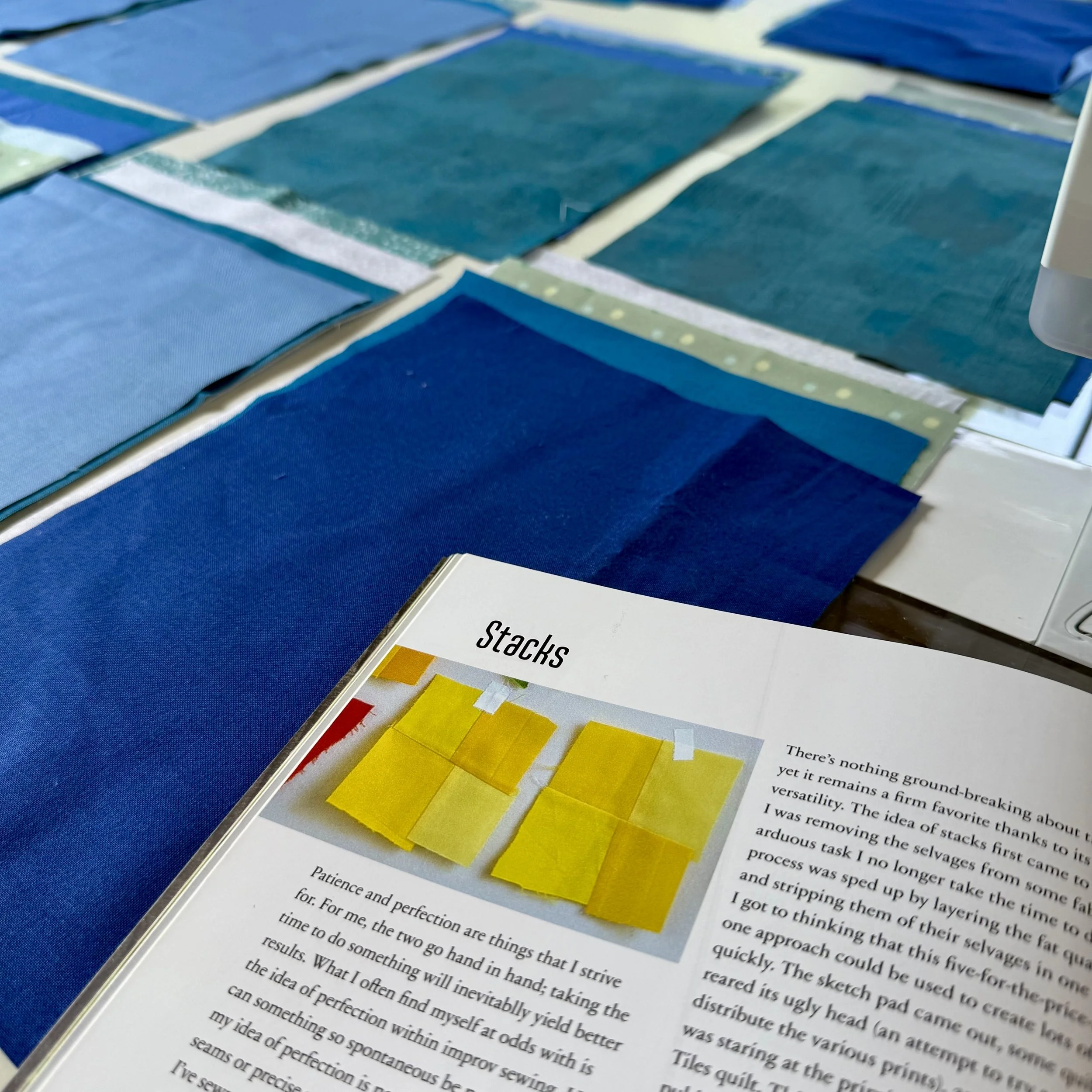 This pattern is from Nicholas Ball’s book called Inspiring Improv. I cut four rectangles from each color and then mixed them up into 12 stacks of 4.