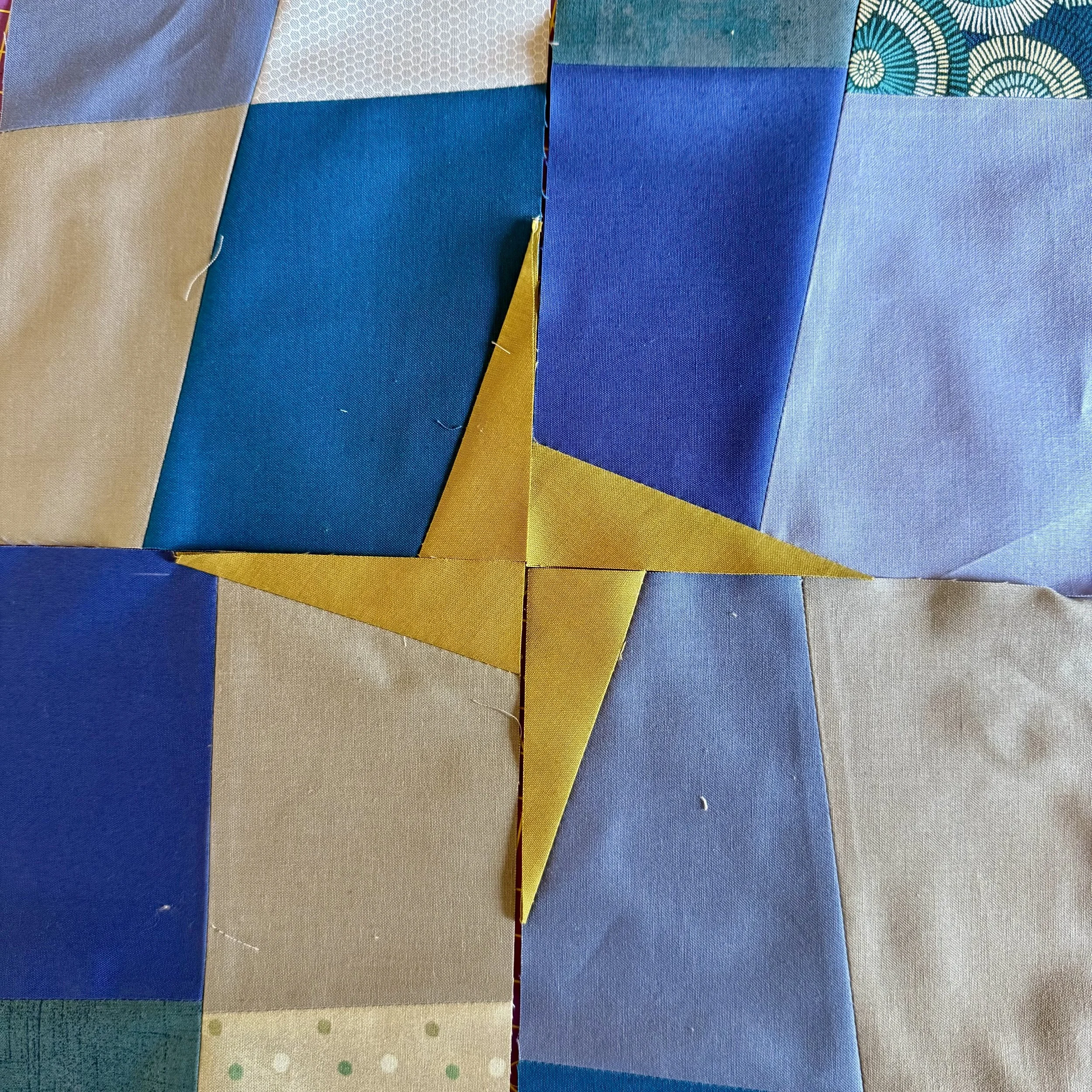 I didn’t measure or worry about matching seems. It’s all very random. I used the same process with the remaining 11 stacks. I chose Kona Cotton Pickle for my highlight color and place random pieces throughout the quilt. I made a star shape for the center.