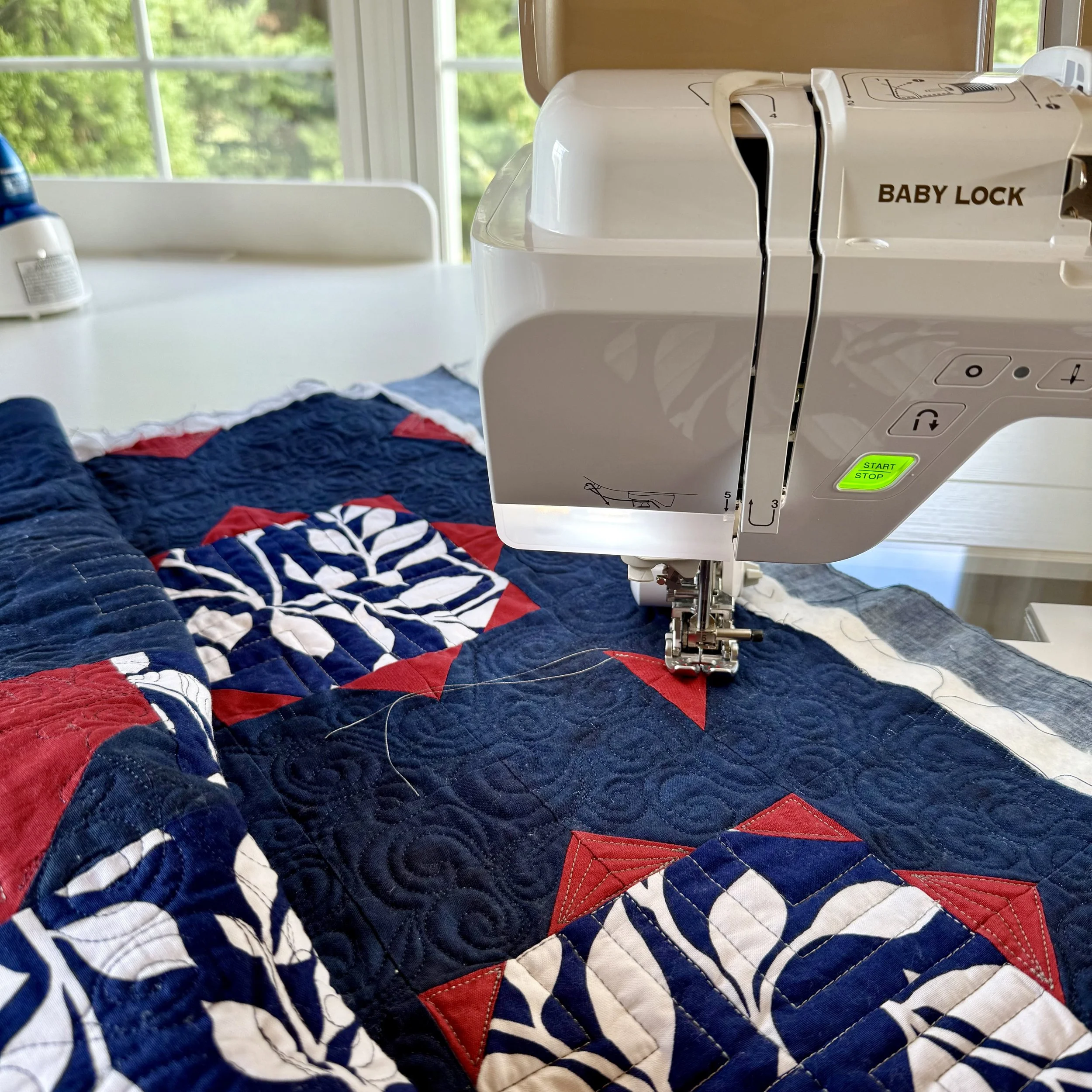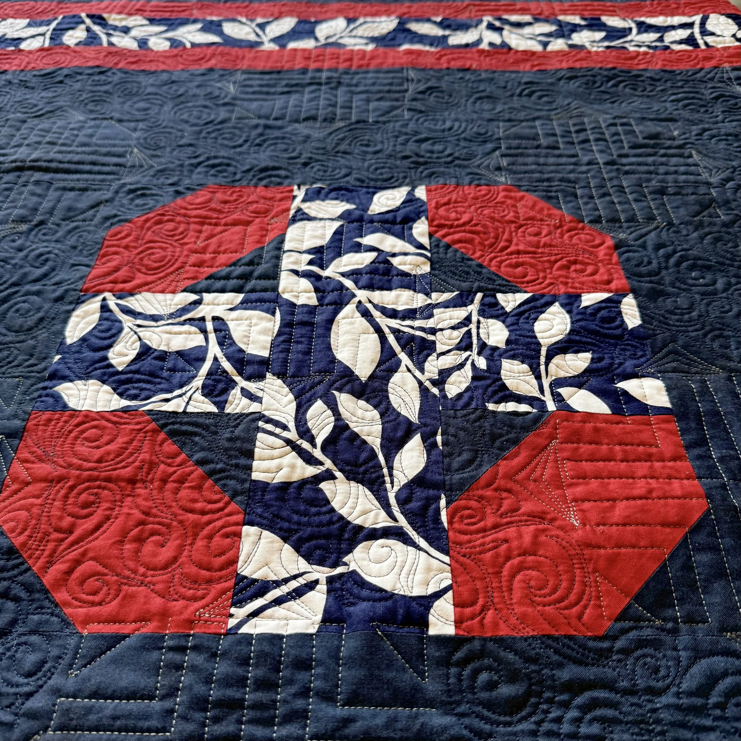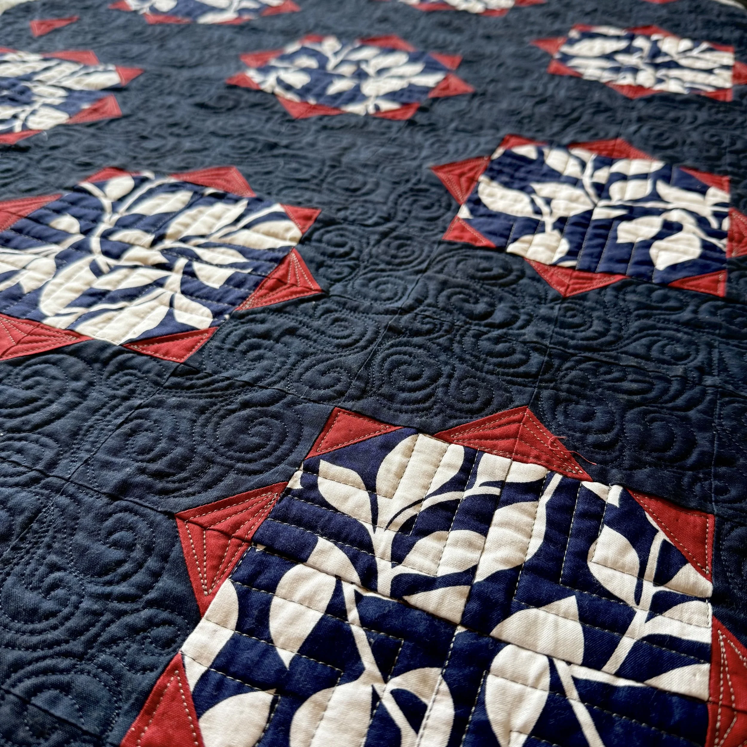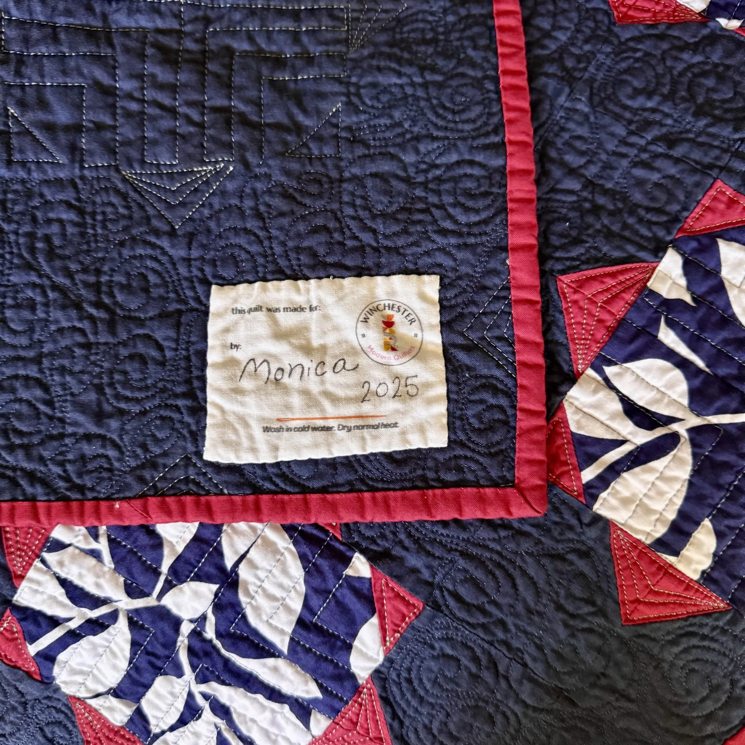 I made this quilt for a donation so I took the opportunity to use it to practice my free motion quilting. I quilted swirls on the background blue.