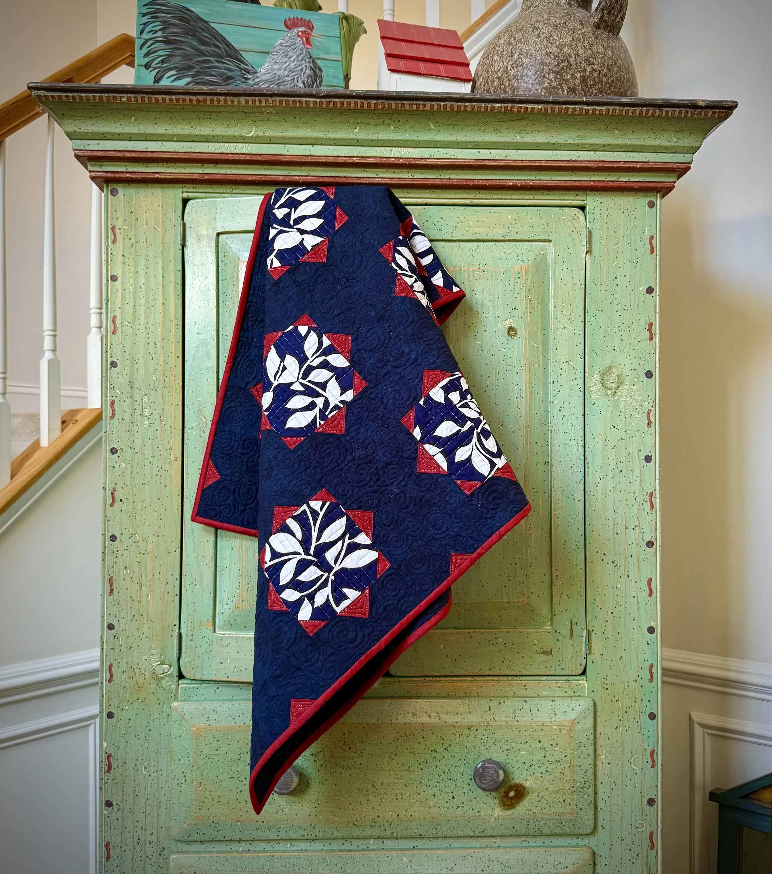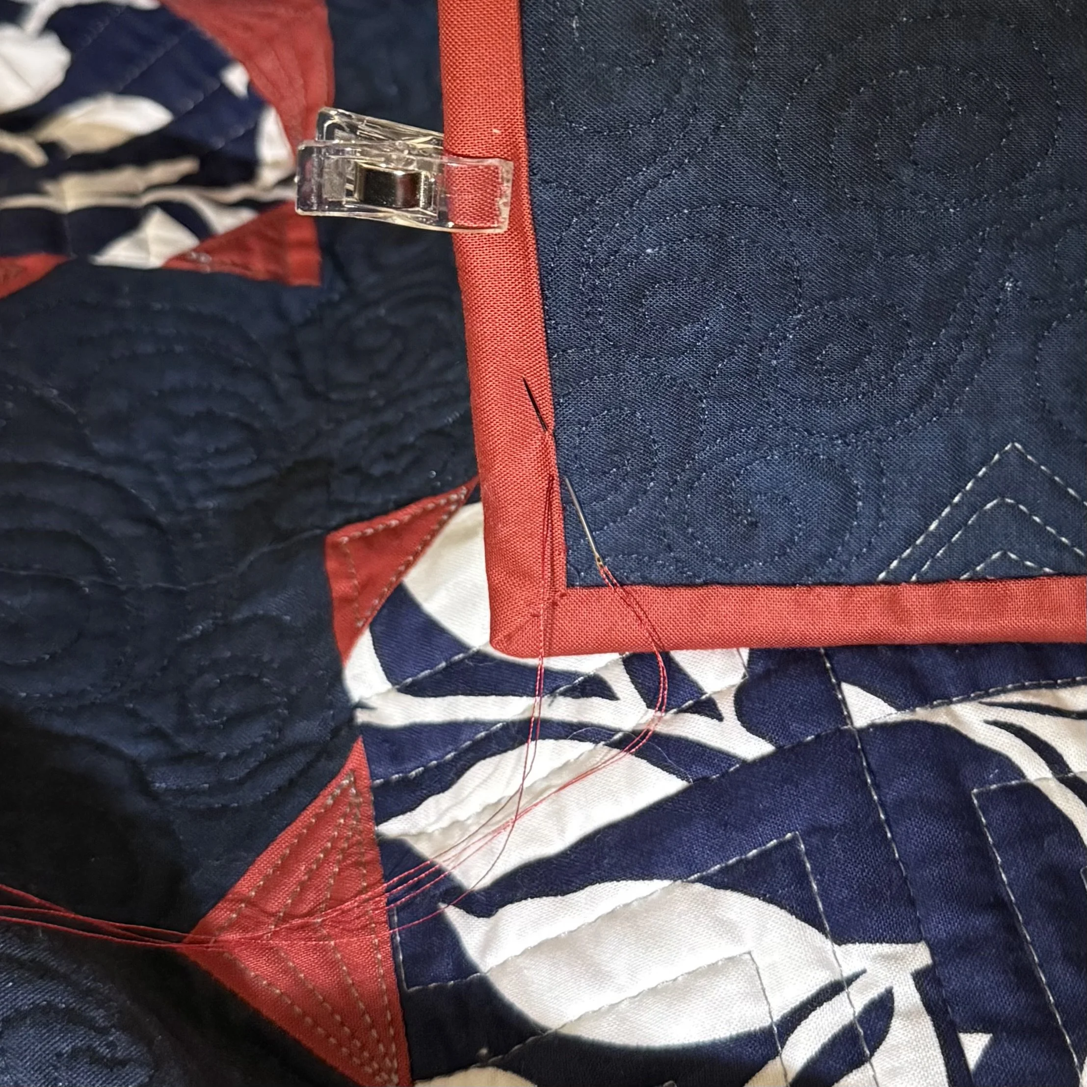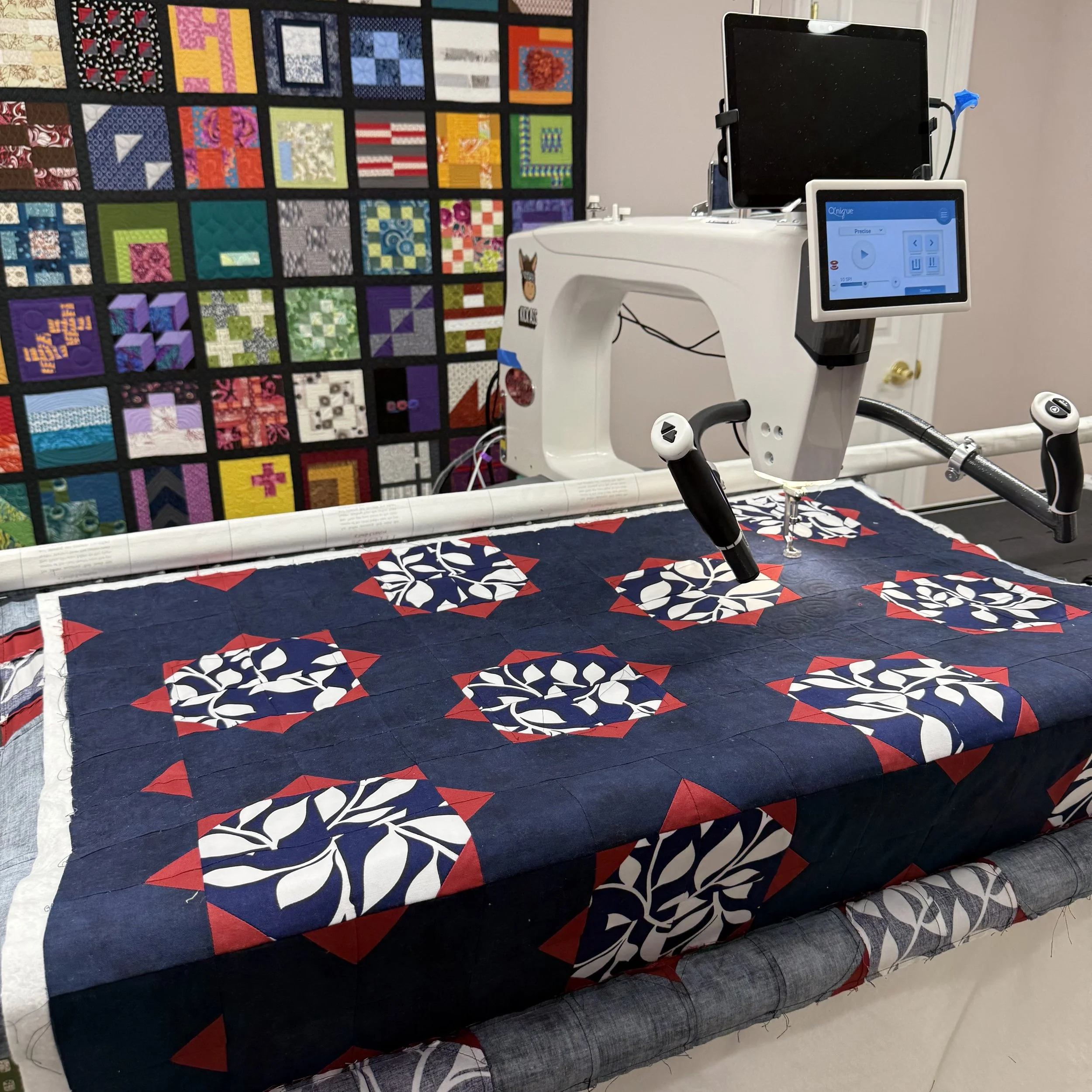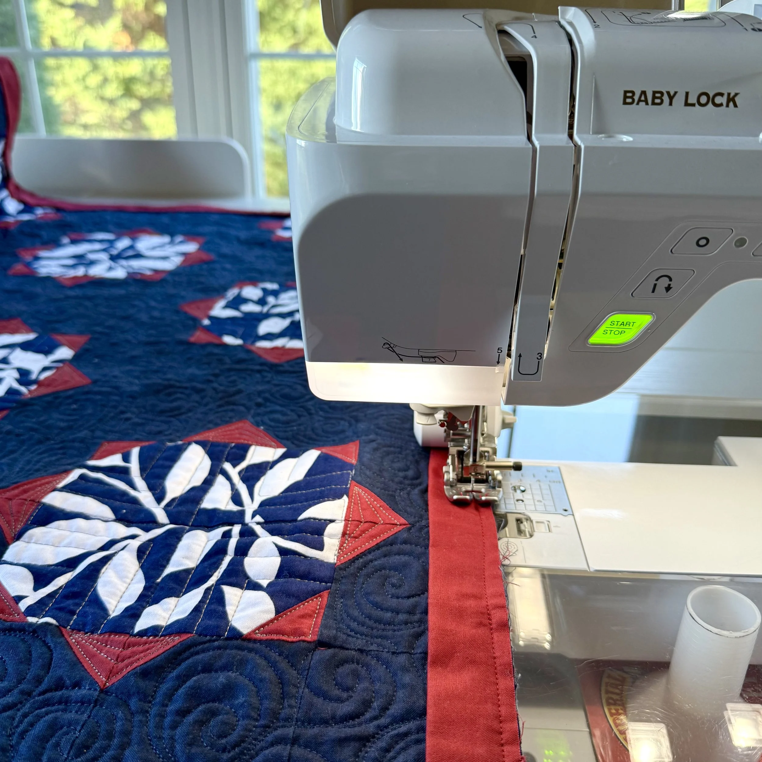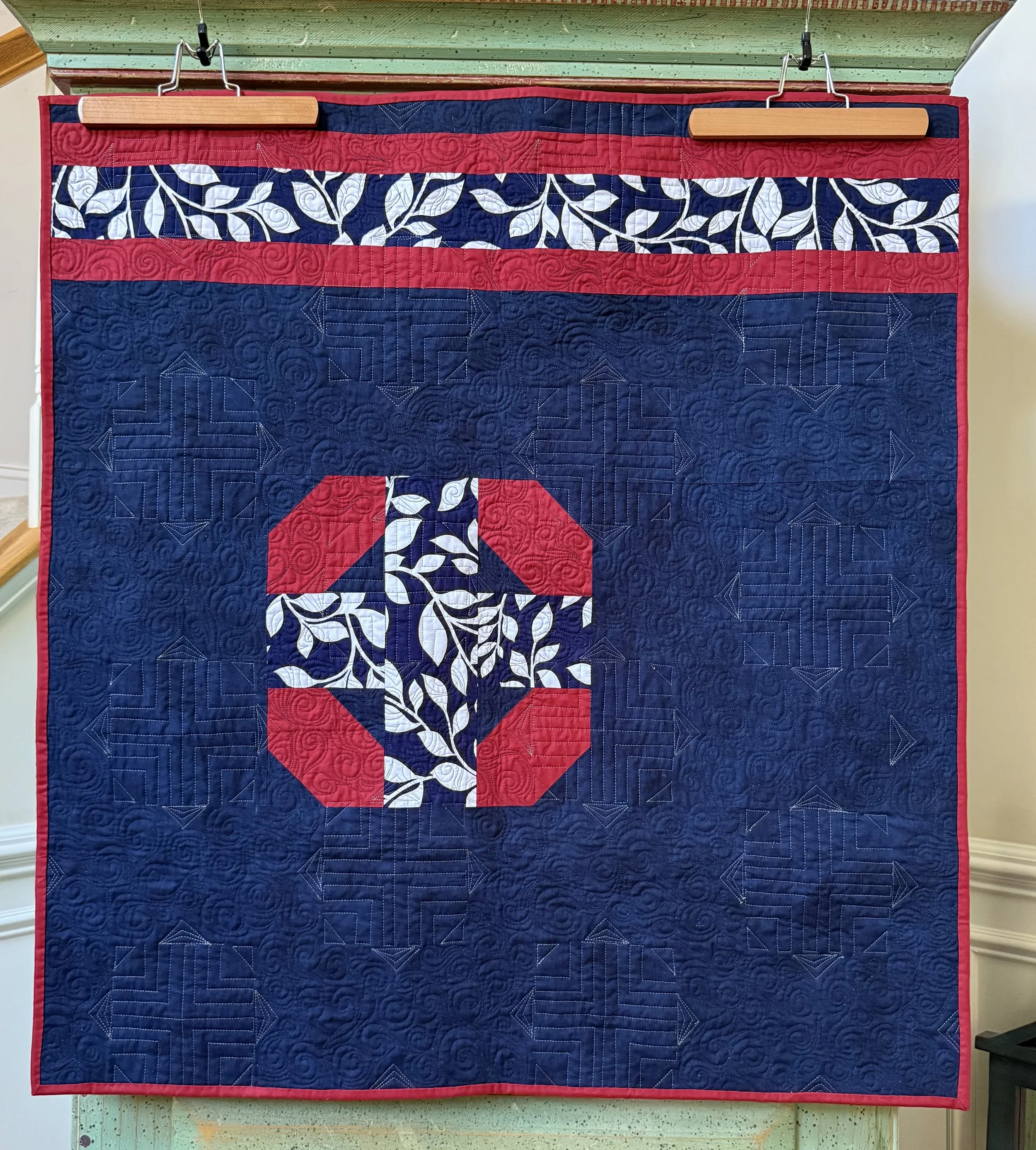 I made this quilt for a donation so I took the opportunity to use it to practice my free motion quilting. I quilted swirls on the background blue.
