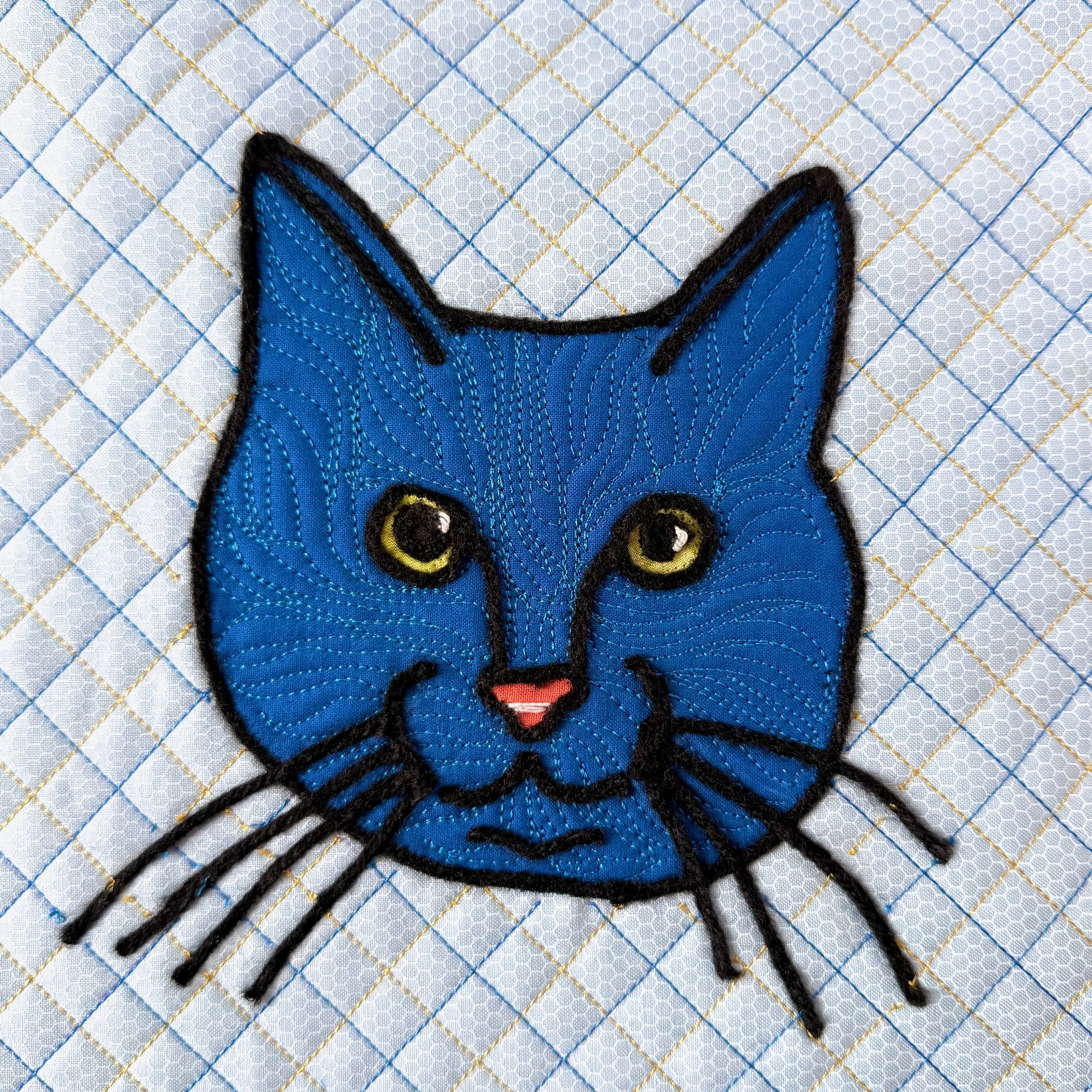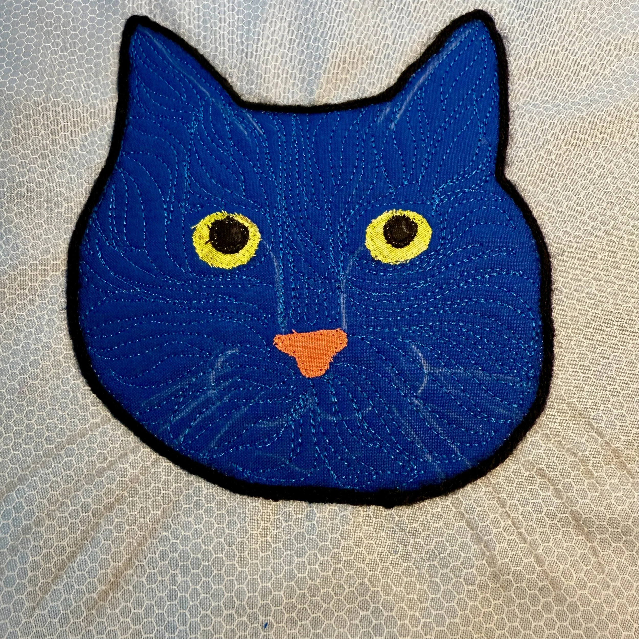 Using invisible thread, I zig-zag stitched the edge of the pieces to prevent fraying. I quilted the face on my long arm with a free motion motif, trying to stay with the same flow as the fur on his face. The black outline is a technique called couching where you sew yarn to either outline an edge or use it as a filler.