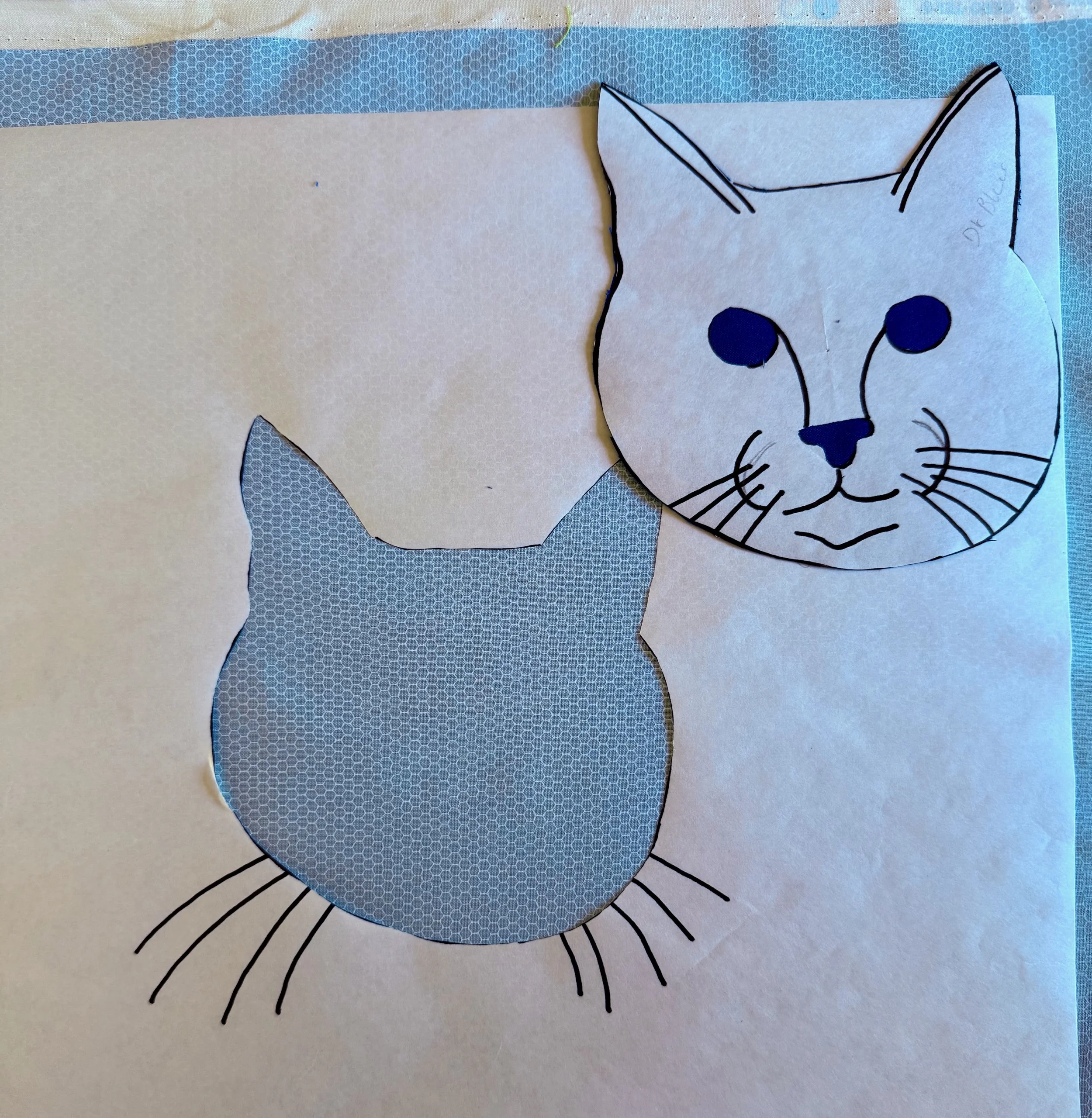 After doing a simple tracing on freezer paper, I cut out the the pieces and ironed them onto my chosen fabrics that were treated with a fusible product.